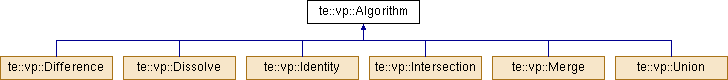 Implemented in te::vp::Dissolve, te::vp::Merge, te::vp::Difference, te::vp::Intersection, te::vp::Identity, and te::vp::Union.