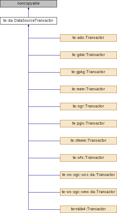 Implemented in te::ws::ogc::wms::da::Transactor, te::ws::ogc::wcs::da::Transactor, te::wfs::Transactor, terralib4::Transactor, te::stmem::Transactor, te::gpkg::Transactor, te::pgis::Transactor, te::ogr::Transactor, te::gdal::Transactor, and te::ado::Transactor.