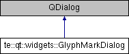 A dialog used to build a glyph mark element. If you want to use this dialog, you can use commands like: te::se::Mark* m = te::qt::widgets::GlyphMarkWidget::getMark(0, parent, "Title"); te::se::Mark* m = te::qt::widgets::GlyphMarkWidget::getMark(initialMark, parent, "Title"); ... delete m;
