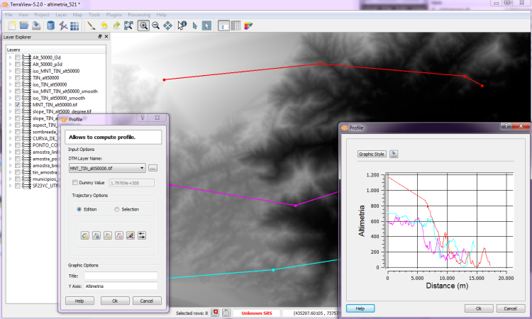 A certain type of DTM, such as a topographic surface, can be represented through profiles which describe point elevation (z value) in a line. This action is performed over numeric model data (grid or isoline) in raster format, presenting in a chart the z value equivalent to point that define the trajectory.