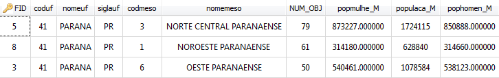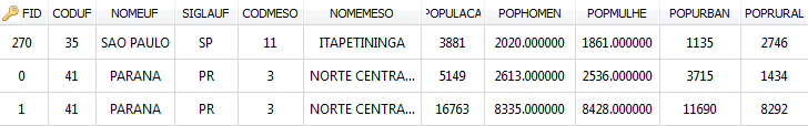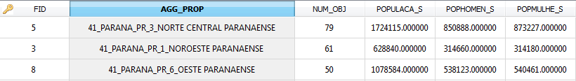 As an example suppose the dissolve applied in a shape file using the following attributes: CODUF, NOMEUF, SIGLAUF, CODMESO, NOMEMESO, and using the statistical parameter SUM over POPULACA, POPHOMEN, POPMULHE. The input data is showed bellow: