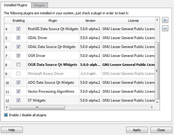 Each line presented in the table represents a plugin in the system. Note in the Enabling column that there are some plugins checked and others are not checked. The plugins checked are loaded with the applicaton and the unchecked are not loaded even though they are available in the system.